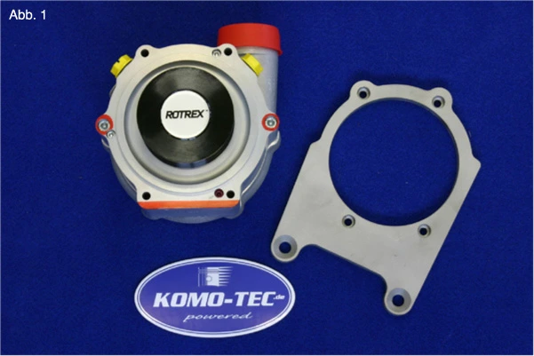 The weight of the supercharger, the forces generated by its drive, and engine vibrations require a stable mounting of the supercharger. A plate (e.g., made of high-strength aluminum or “stainless steel”) can be secured using the 4 mounting screws that connect the supercharger housing and the gearbox housing, through which all forces are transmitted. (see also Fig. 1)