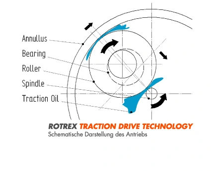 The Rotrex-patented system uses a preloaded elliptical ring to generate uniform friction with low forces between the outer rollers, the housing, and the inner torque shaft. The patented “Ramp Effect” increases efficiency and service life through self-regulating torque on the outer ring, depending on the required force.