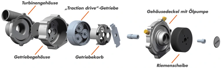 The patented friction-optimized planetary gearbox forms the technical foundation of the Rotrex radial compressor, which combines high mechanical and thermodynamic efficiency with compact dimensions, low weight, and low noise levels.